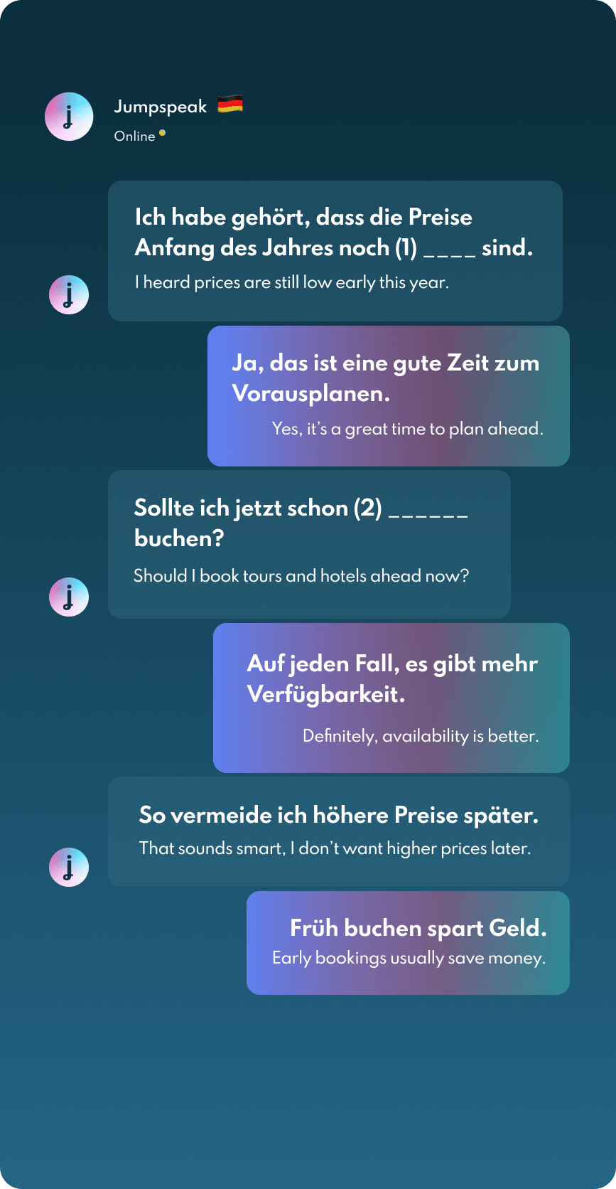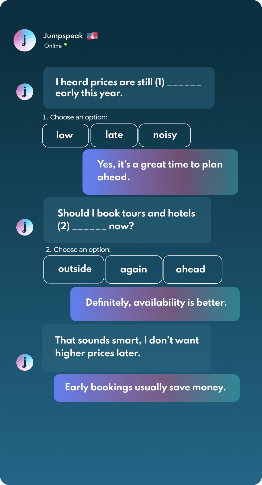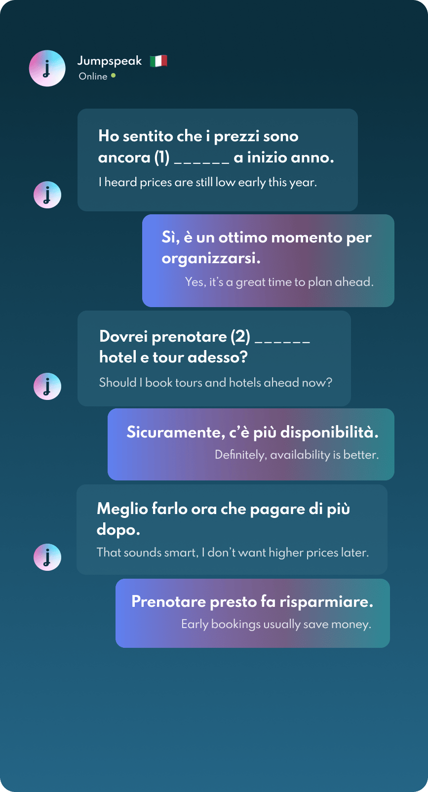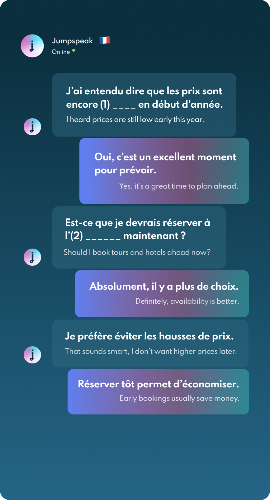 Jumpspeak is an immersion-focused language app that gets you speaking a new language on day one using real-life conversations. Learn Spanish, French, Italian, German, and more languages (20 available!) using AI Immersion. You can practice speaking without any fear of embarrassment, as if you have a personal AI tutor in your pocket.
