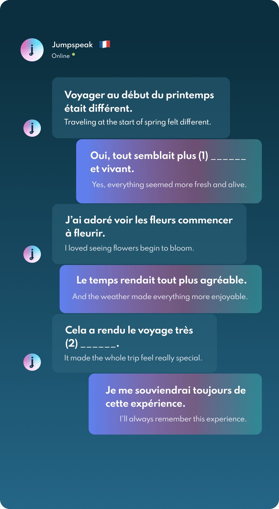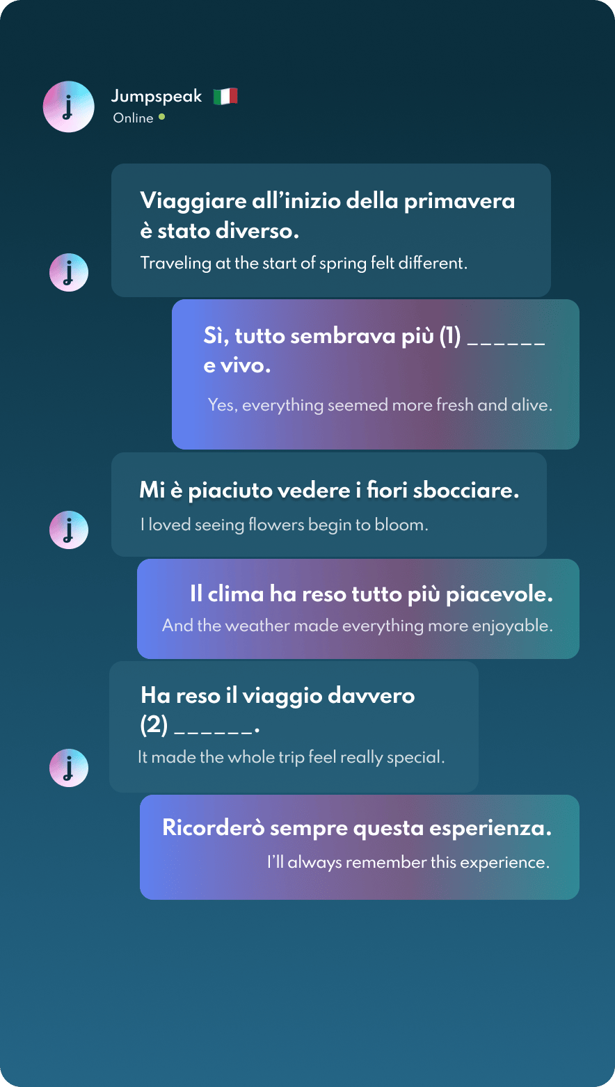 Jumpspeak is an immersion-focused language app that gets you speaking a new language on day one using real-life conversations. Learn Spanish, French, Italian, German, and more languages (20 available!) using AI Immersion. You can practice speaking without any fear of embarrassment, as if you have a personal AI tutor in your pocket.