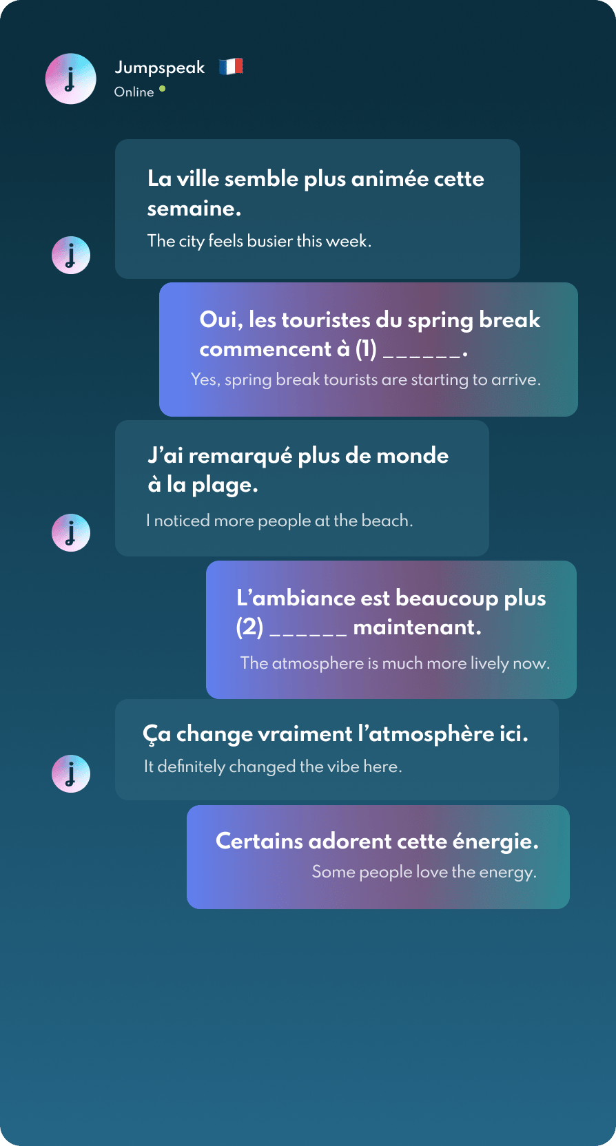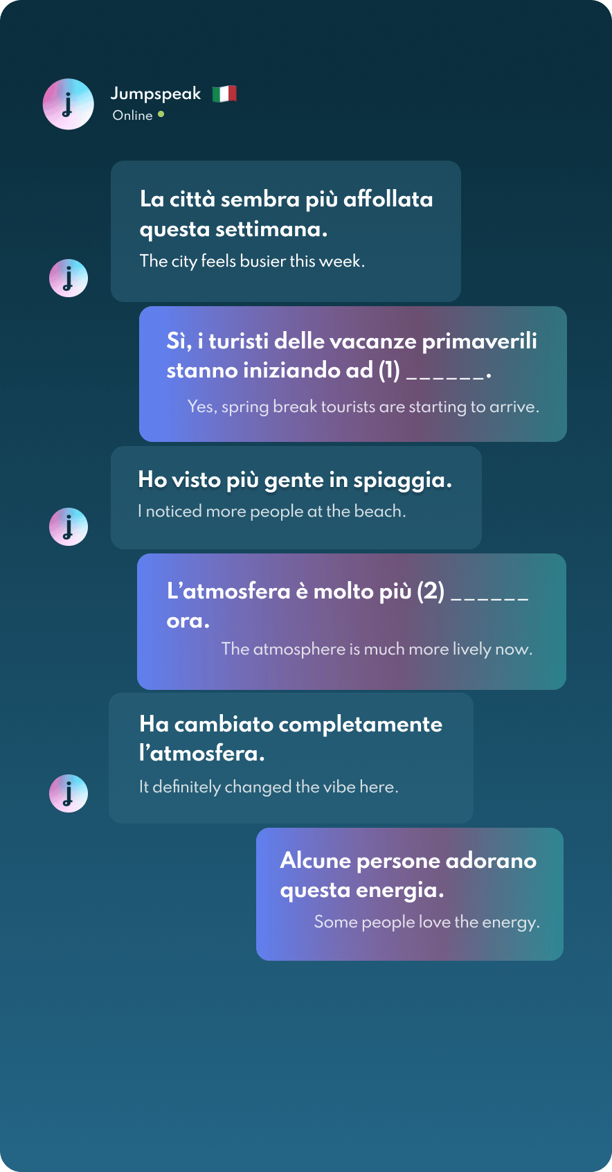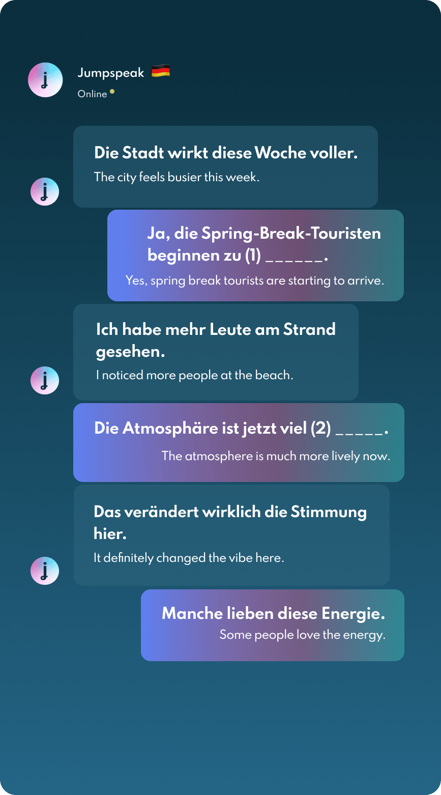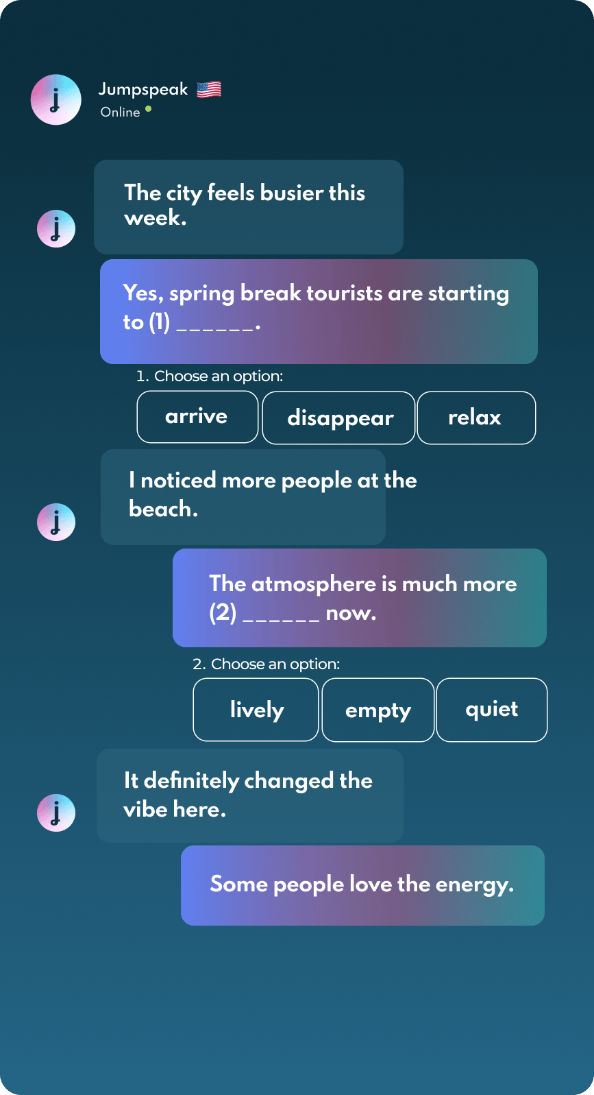 Jumpspeak is an immersion-focused language app that gets you speaking a new language on day one using real-life conversations. Learn Spanish, French, Italian, German, and more languages (20 available!) using AI Immersion. You can practice speaking without any fear of embarrassment, as if you have a personal AI tutor in your pocket.