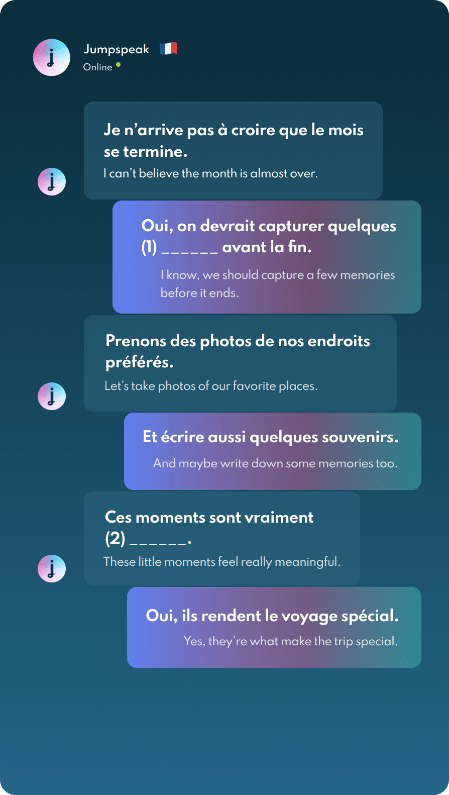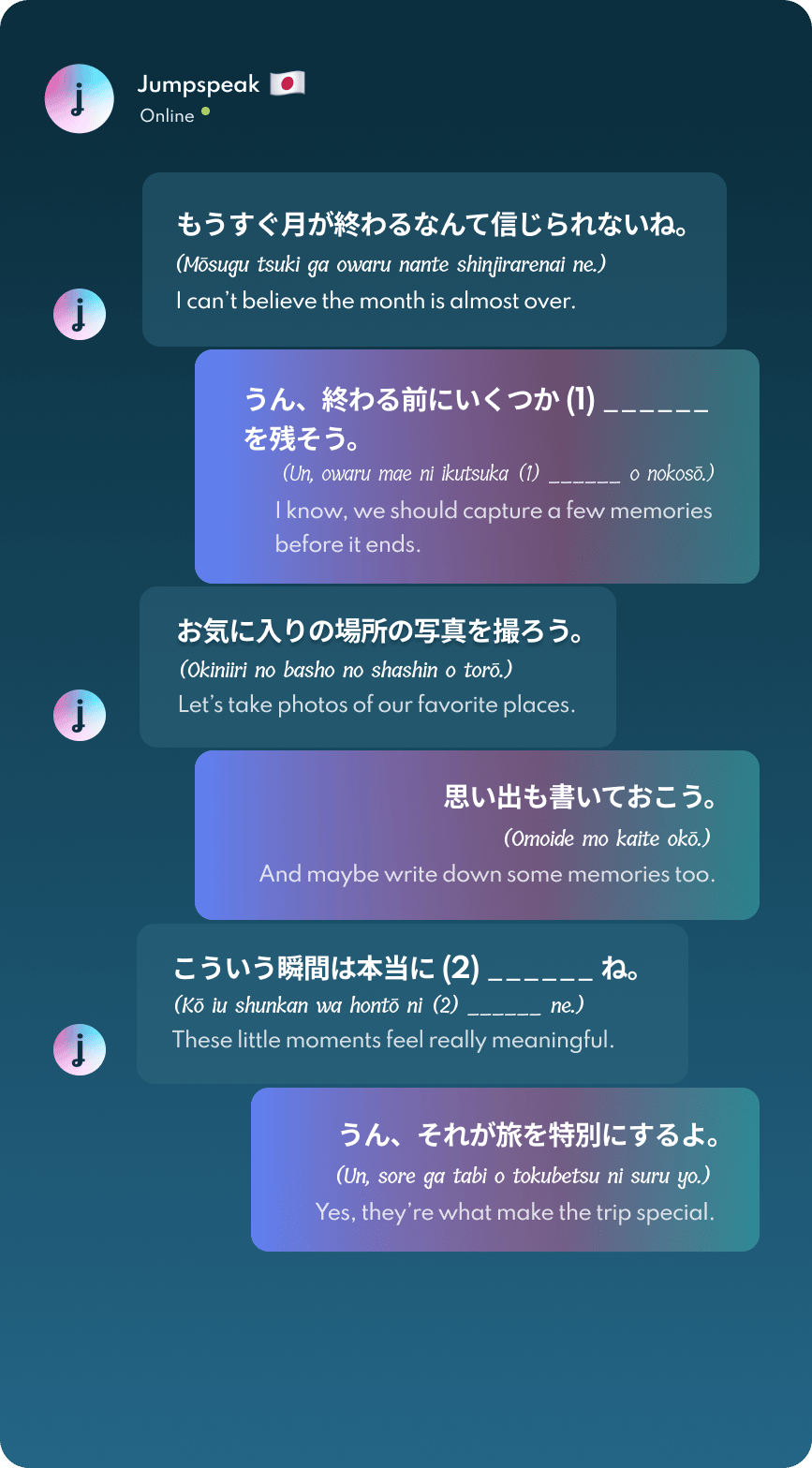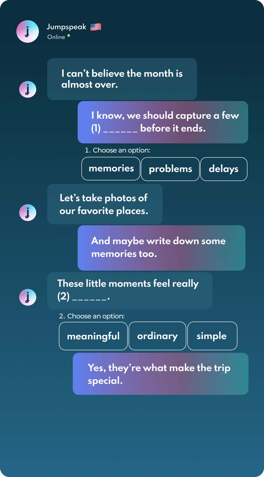 Jumpspeak is an immersion-focused language app that gets you speaking a new language on day one using real-life conversations. Learn Spanish, French, Italian, German, and more languages (20 available!) using AI Immersion. You can practice speaking without any fear of embarrassment, as if you have a personal AI tutor in your pocket.