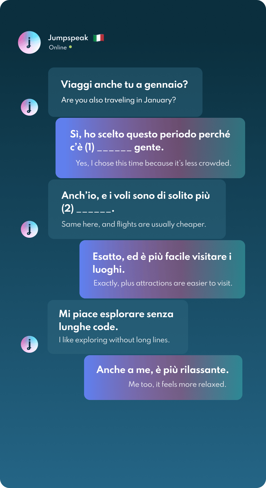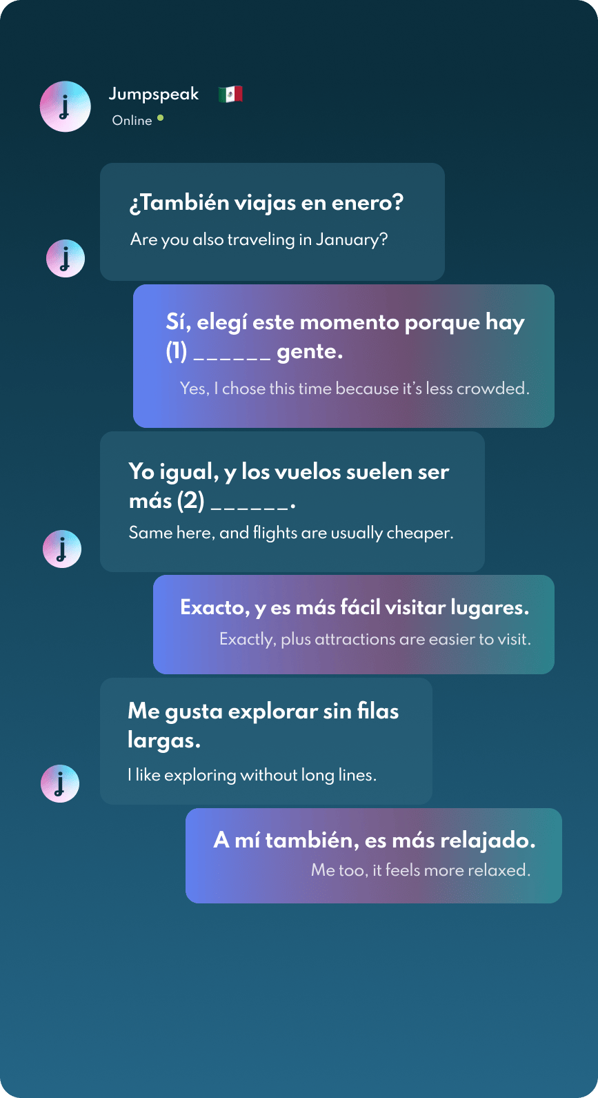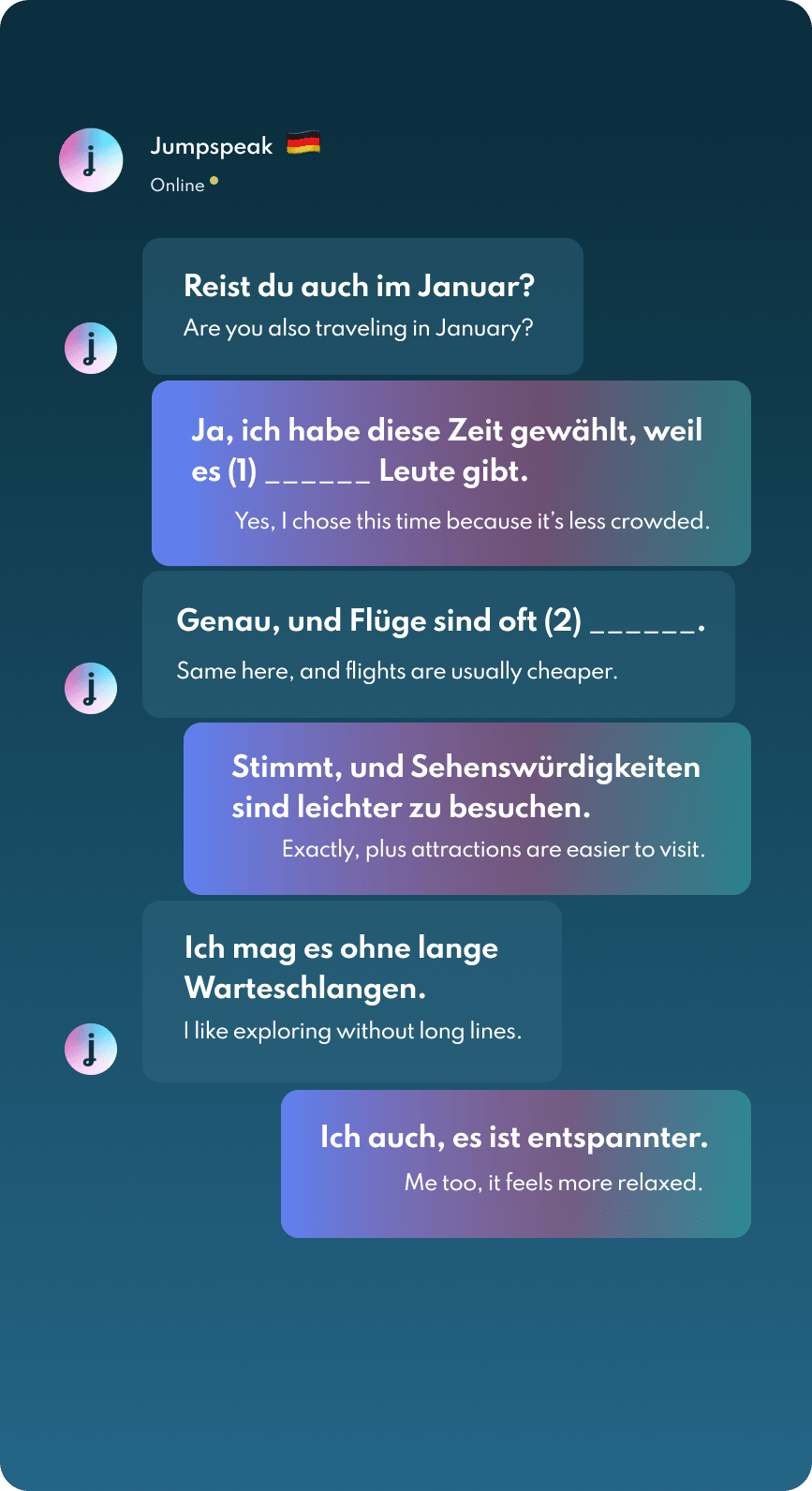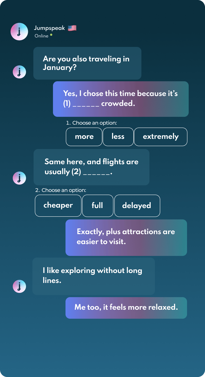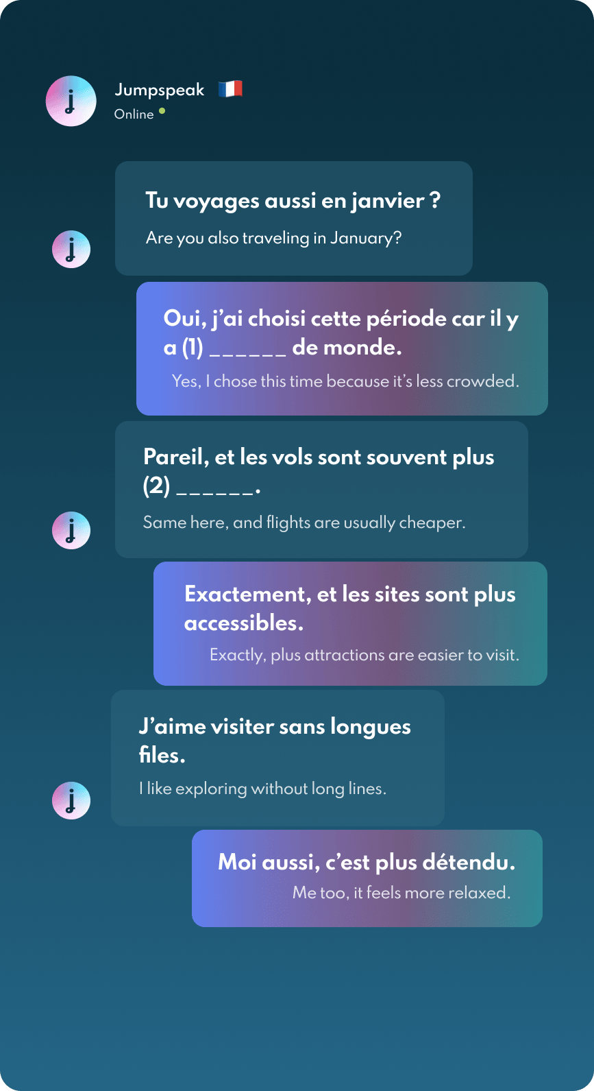 Jumpspeak is an immersion-focused language app that gets you speaking a new language on day one using real-life conversations. Learn Spanish, French, Italian, German, and more languages (20 available!) using AI Immersion. You can practice speaking without any fear of embarrassment, as if you have a personal AI tutor in your pocket.