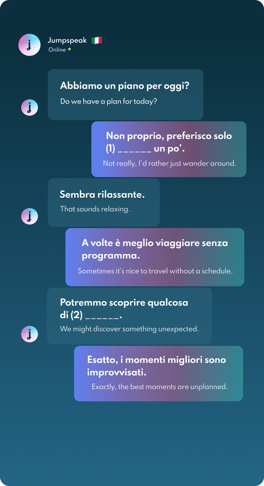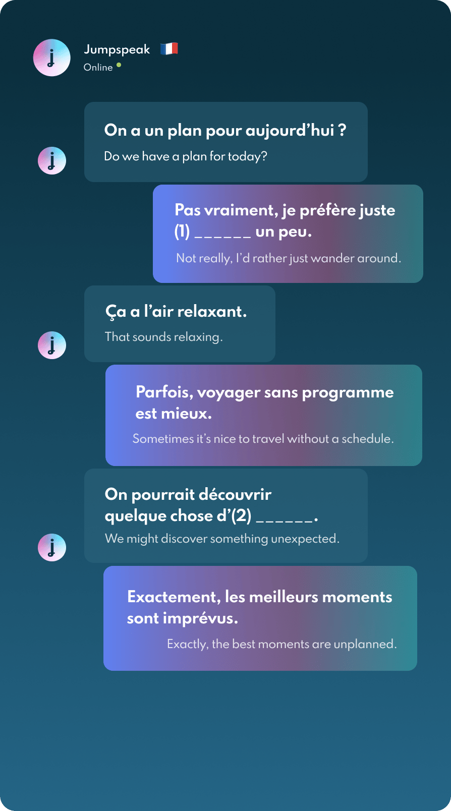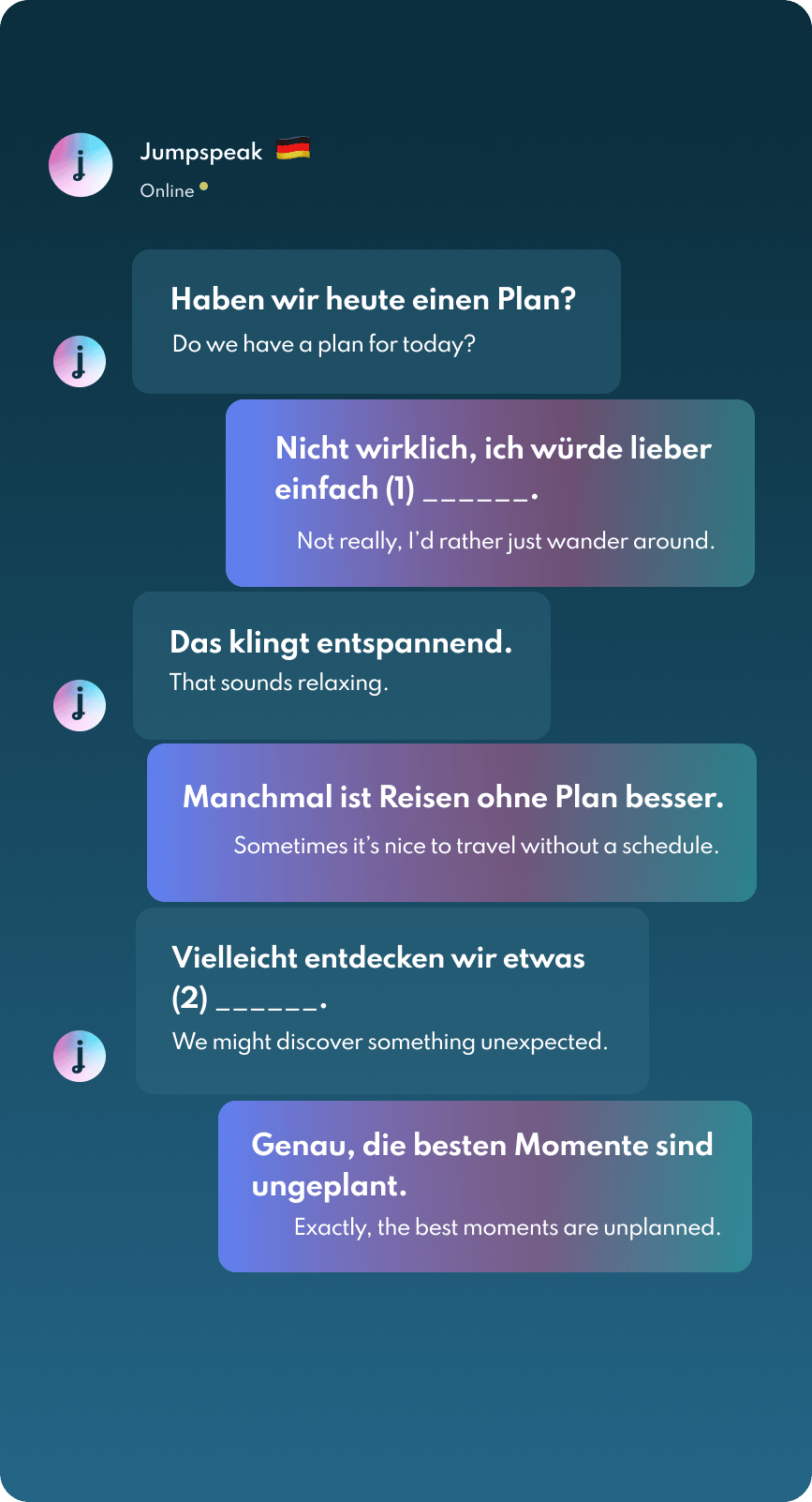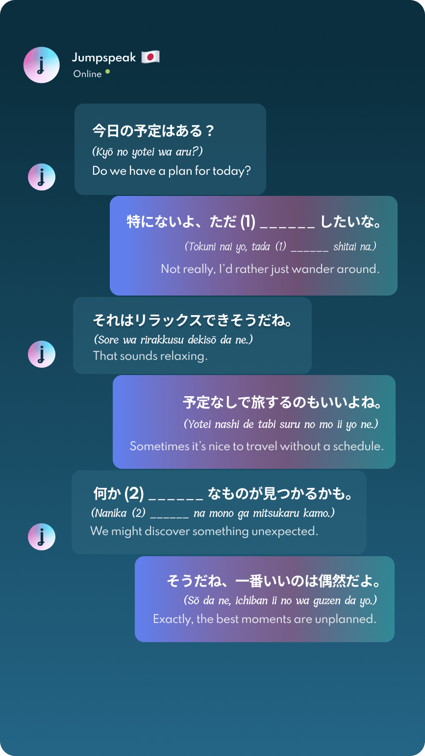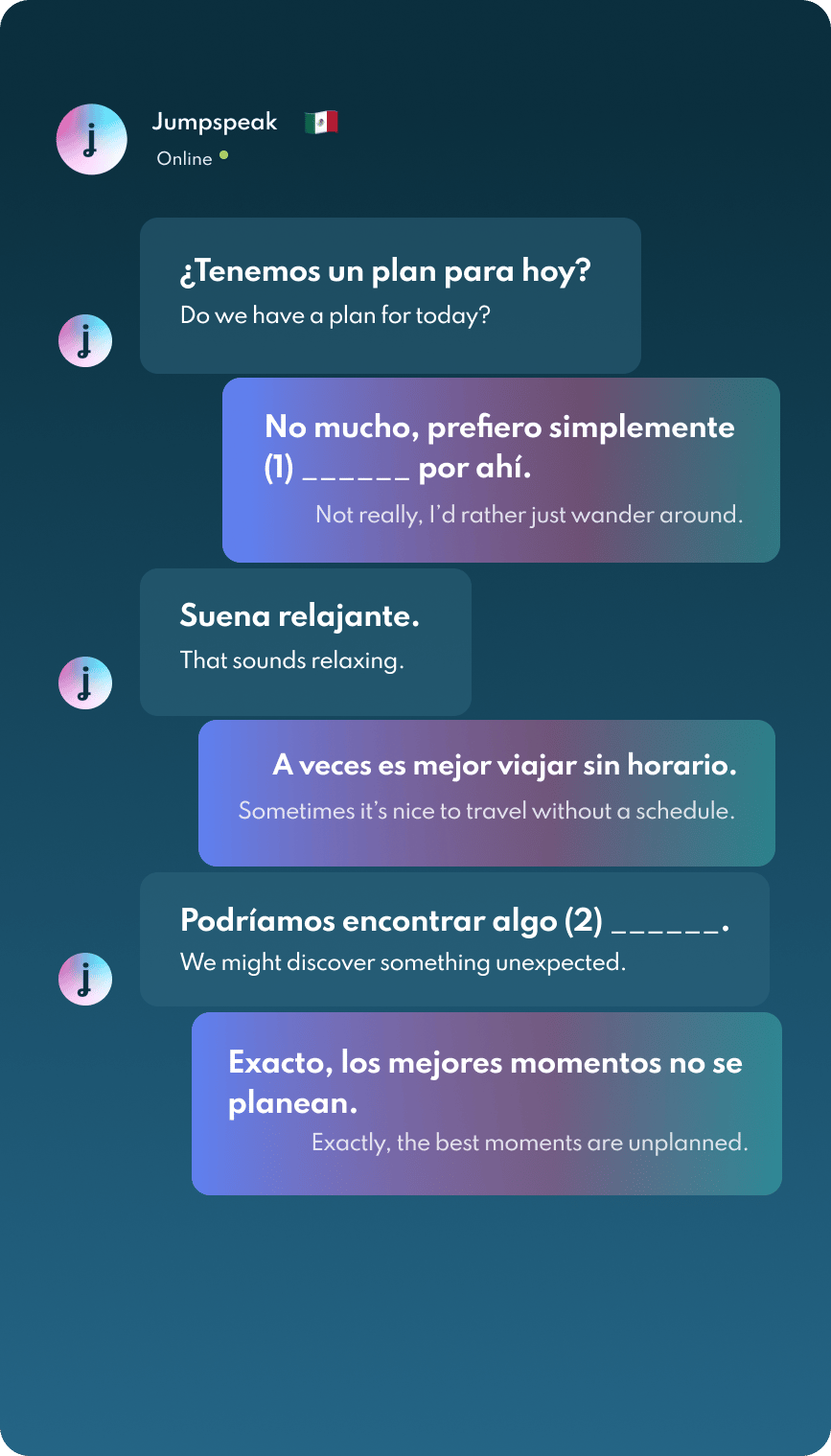 Jumpspeak is an immersion-focused language app that gets you speaking a new language on day one using real-life conversations. Learn Spanish, French, Italian, German, and more languages (20 available!) using AI Immersion. You can practice speaking without any fear of embarrassment, as if you have a personal AI tutor in your pocket.